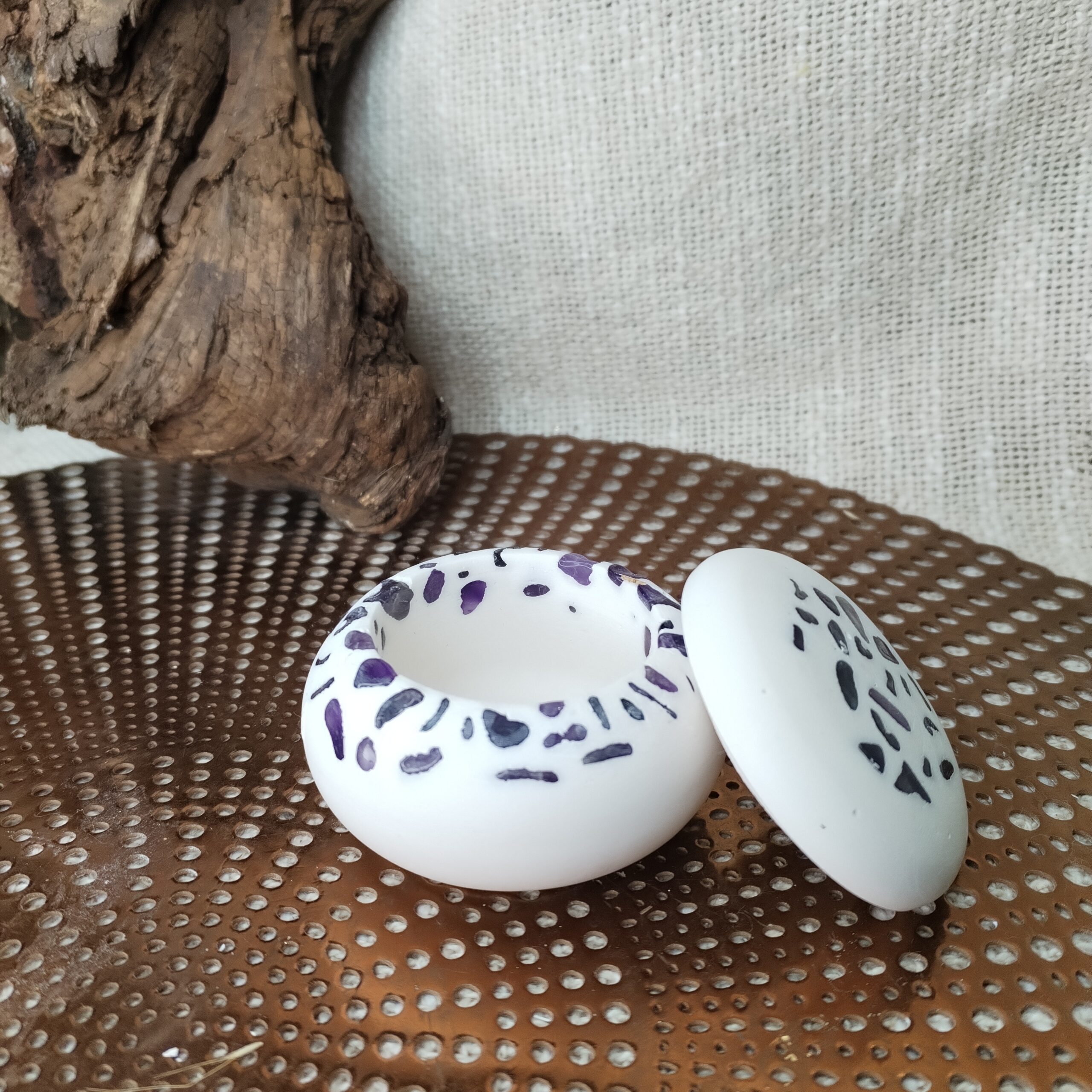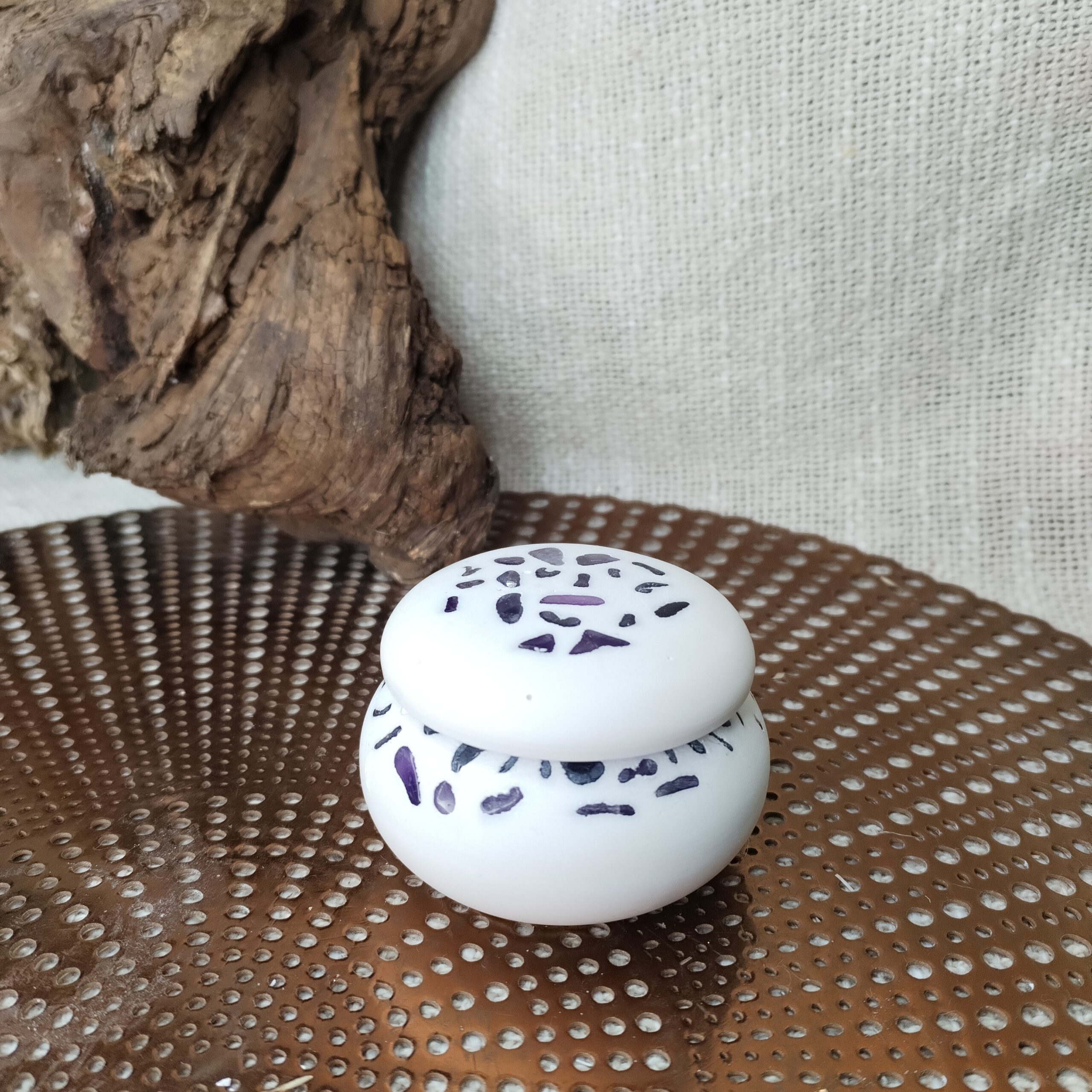 - Incrustation de pierre naturelle : Améthyste provenant de Zambie, chaque pot présente des nuances violettes uniques, créant un contraste fascinant avec la texture douce du jesmonite.