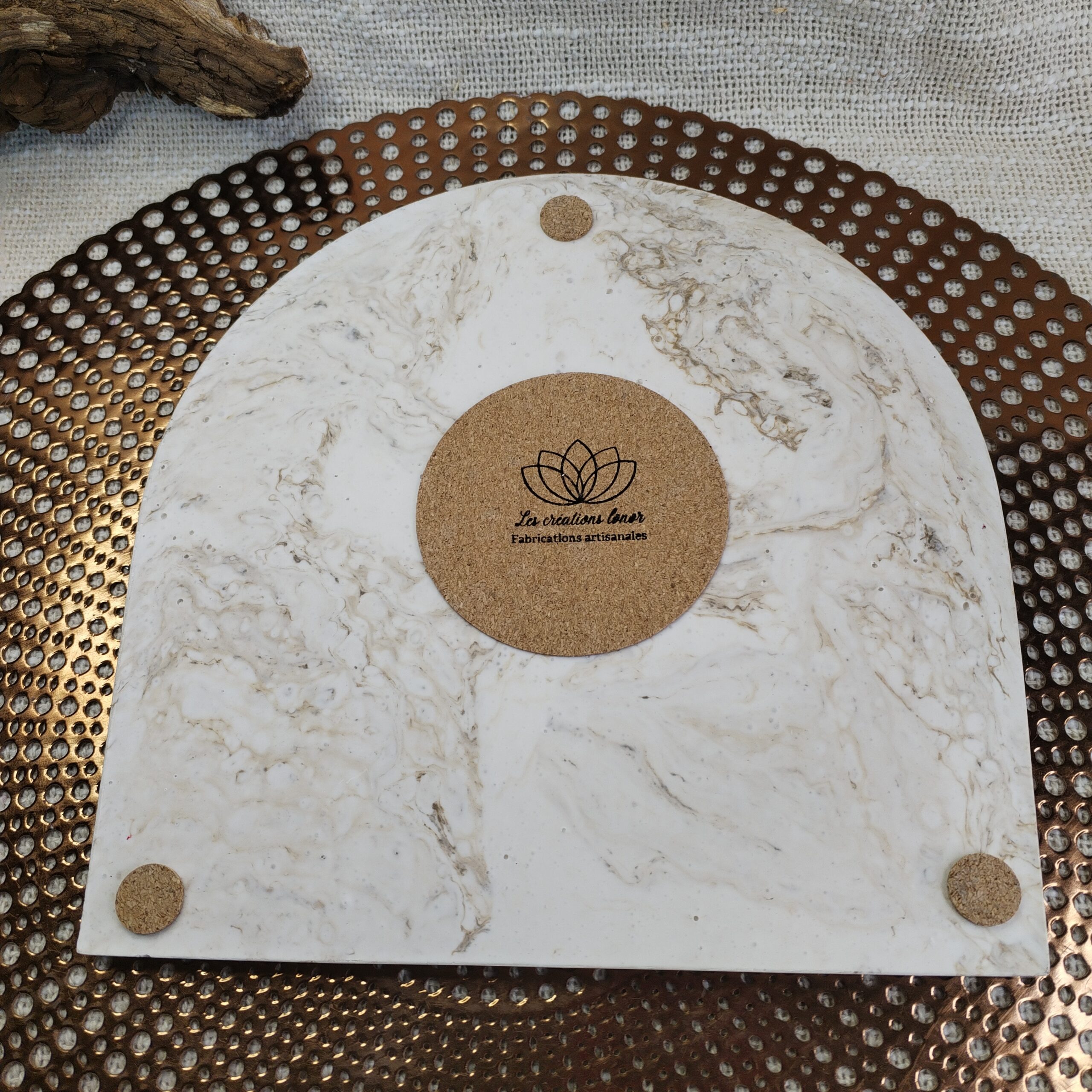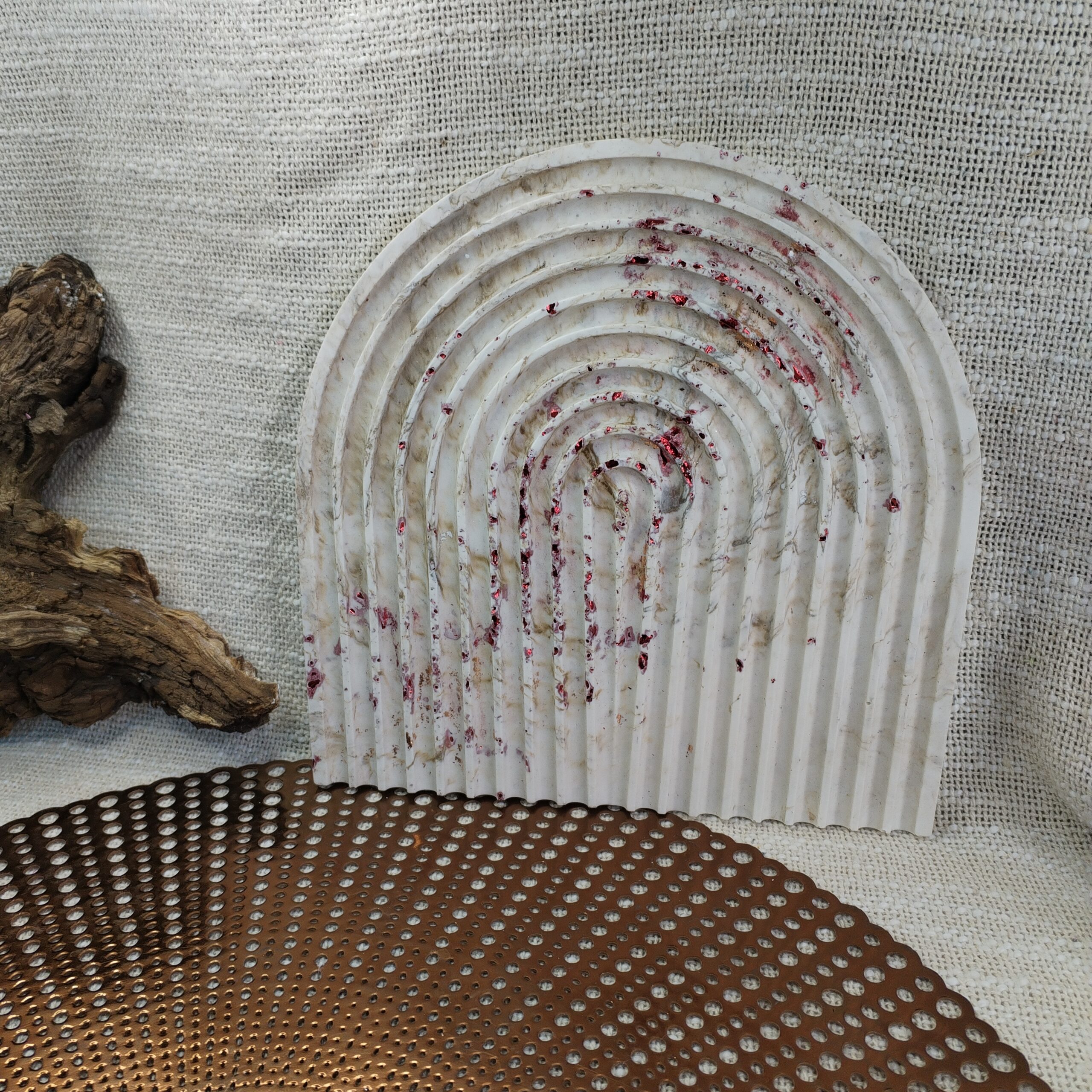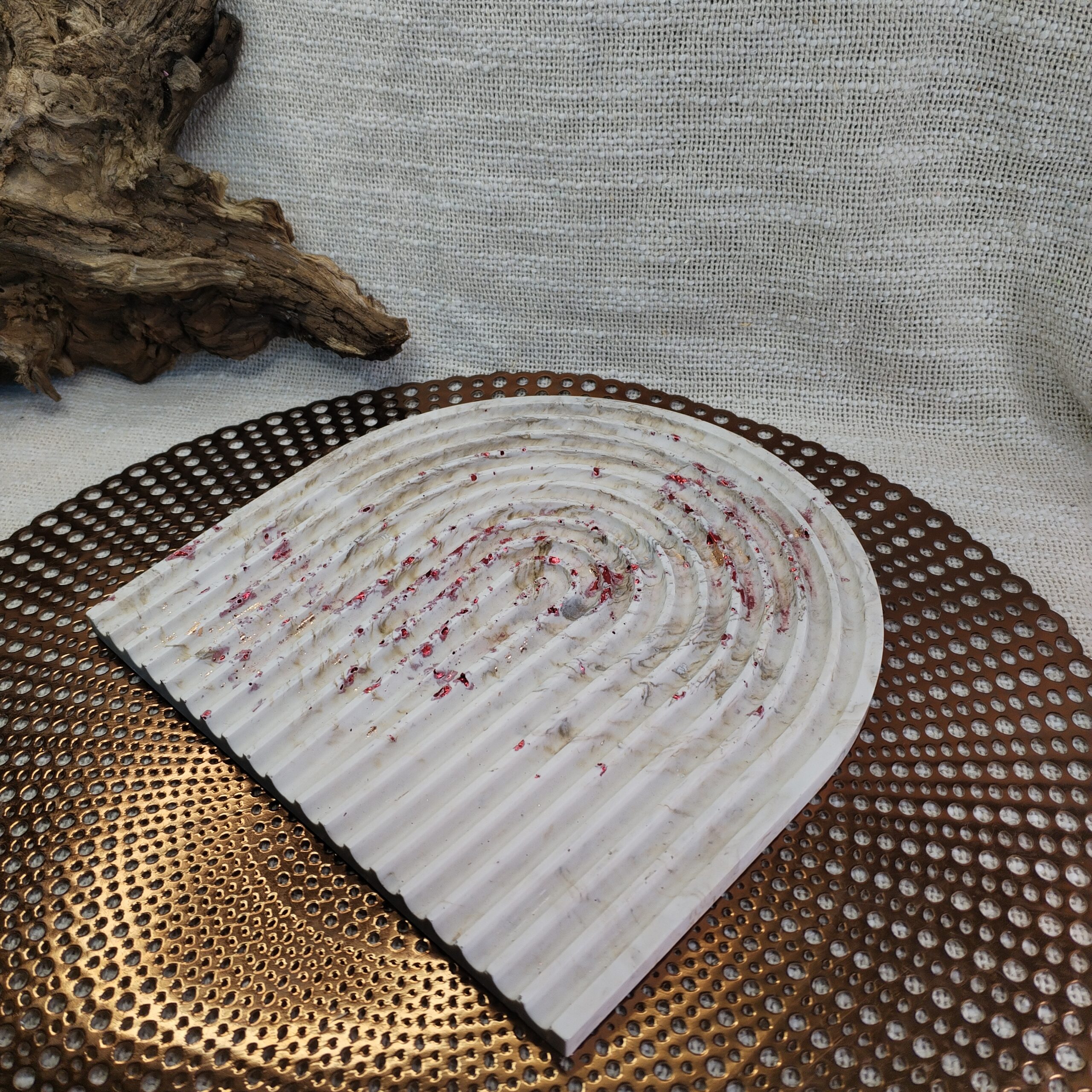 Plateau en Forme d’Arc en Jesmonite Beige avec Feuille d’Or rouge– 22 cm x 22 cm x 1 cm