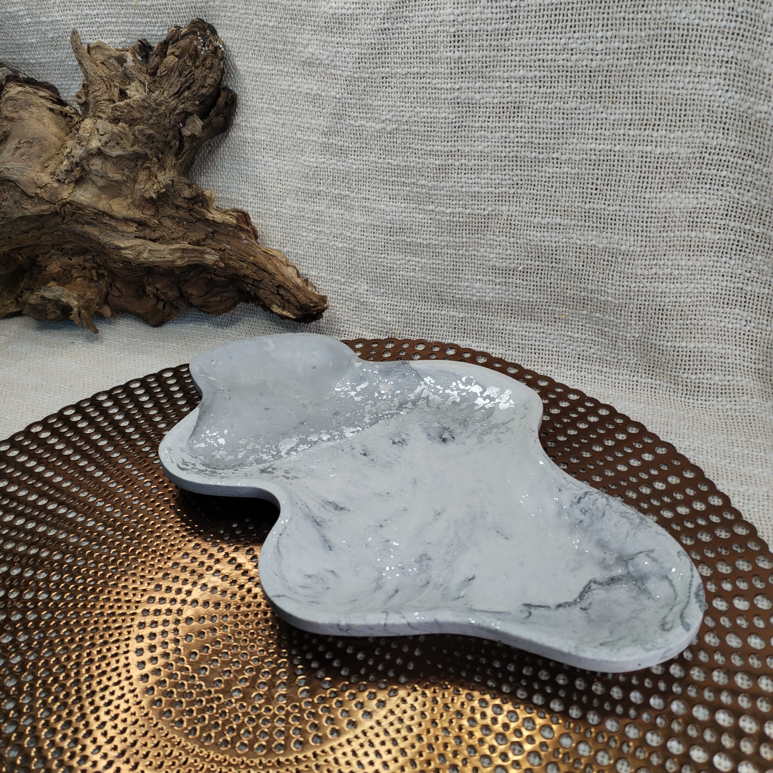 Plateau en Forme de Nuage en Jesmonite Marbré Gris avec Incrustation de Feuille d’Or Argenté – 30 cm x 18 cm x 2 cm