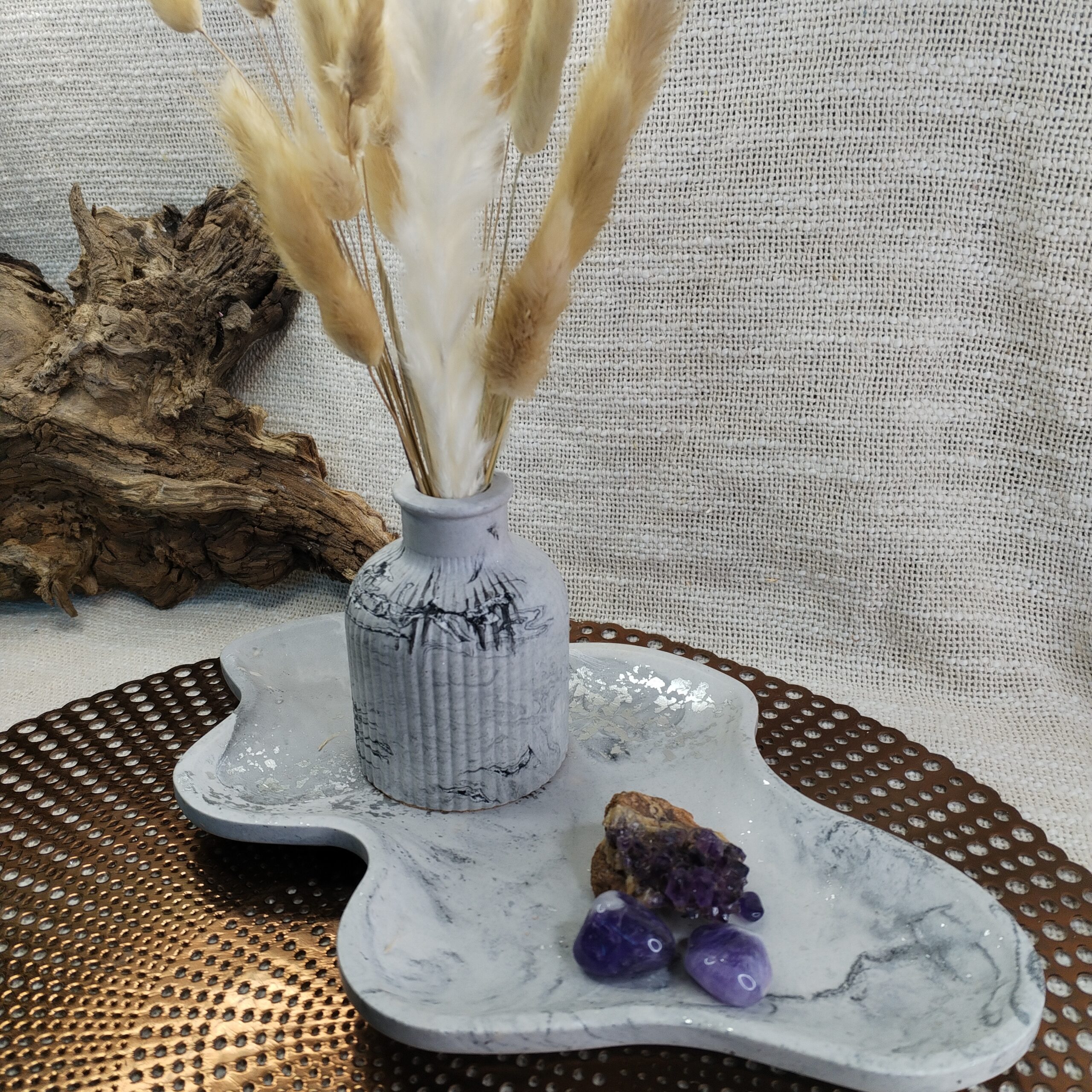 - Matériau principal : Jesmonite marbré gris, un matériau durable et éco-responsable, qui permet d’obtenir une finition lisse et résistante. Sa texture marbrée en nuances subtiles de gris ajoute profondeur et élégance au plateau, tout en offrant une surface solide et pratique.