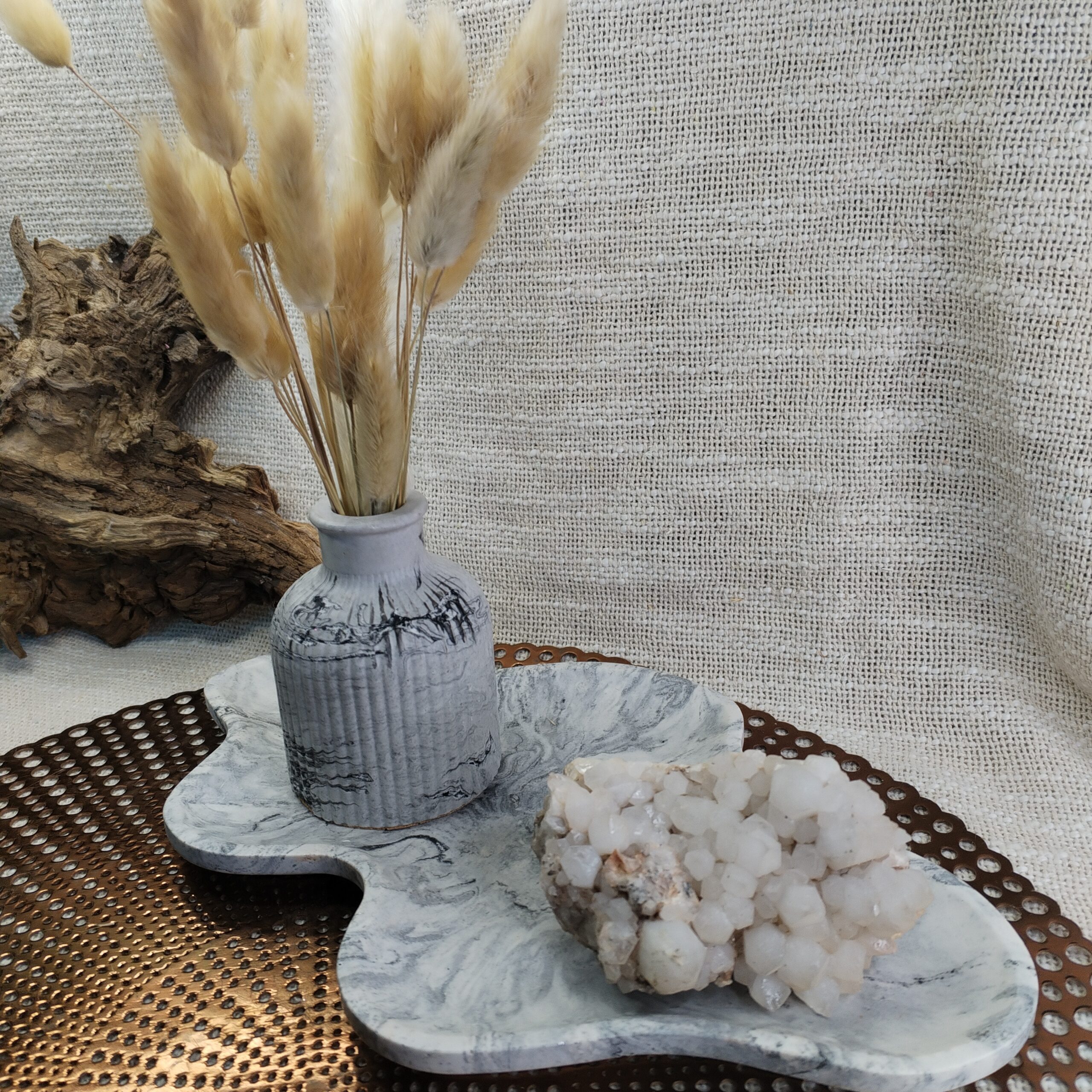 Apportez une touche de douceur et de poésie à votre espace avec ce plateau en jesmonite marbré gris, conçu en forme de nuage. Ce plateau unique allie le design organique et apaisant du nuage à la beauté moderne et élégante du jesmonite marbré, pour un résultat à la fois esthétique et pratique. Parfait pour décorer votre intérieur tout en ajoutant une note de sérénité, il est idéal pour organiser vos petits objets ou servir de support à vos pierres naturelles et cristaux.