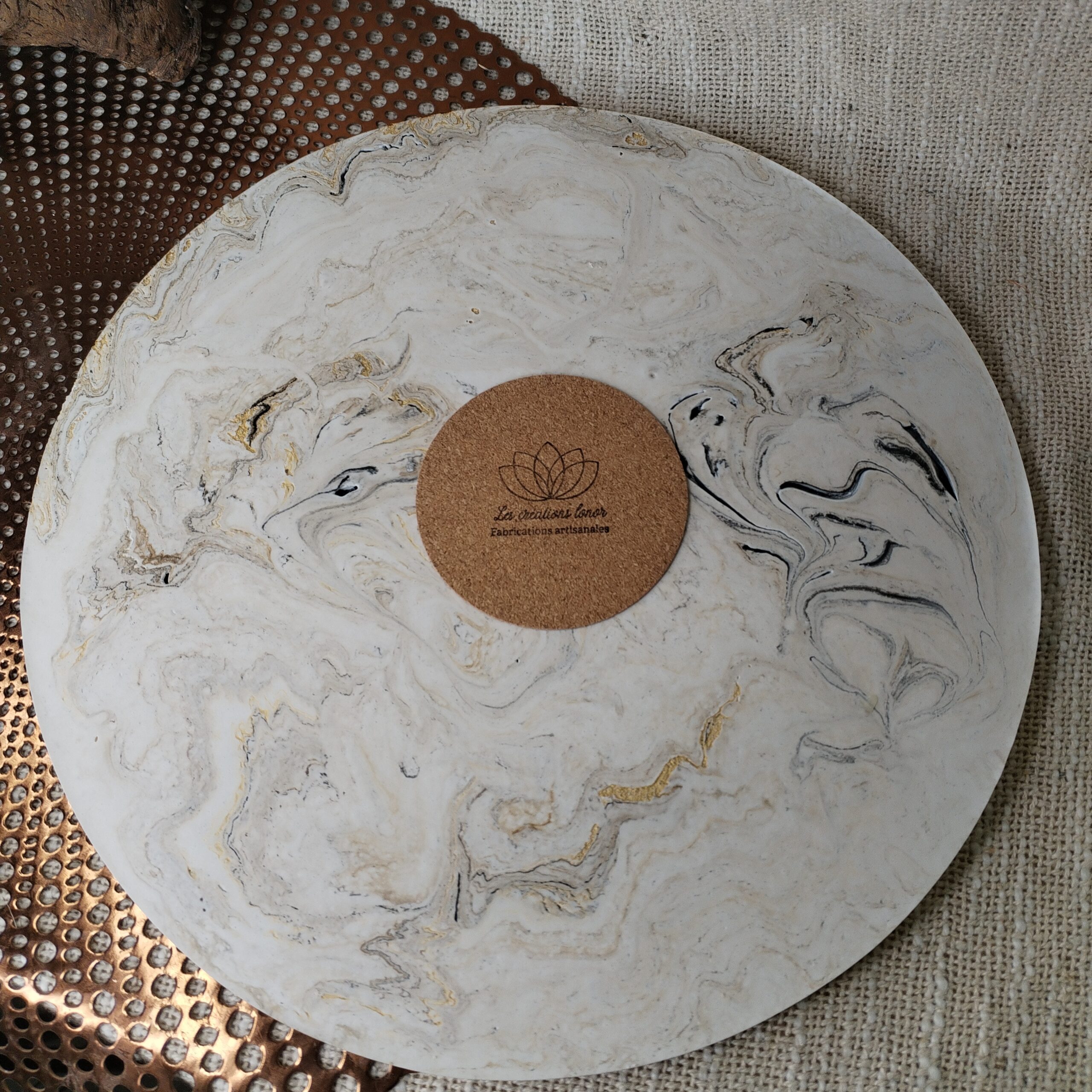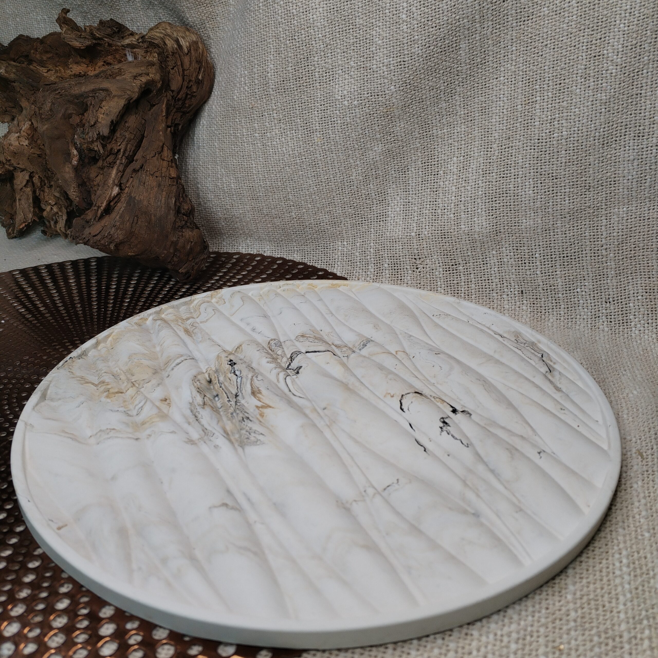 Plateau Rond Ondulé en Jesmonite Marbré Beige, Gris et Doré Protégé en Cire de Coco