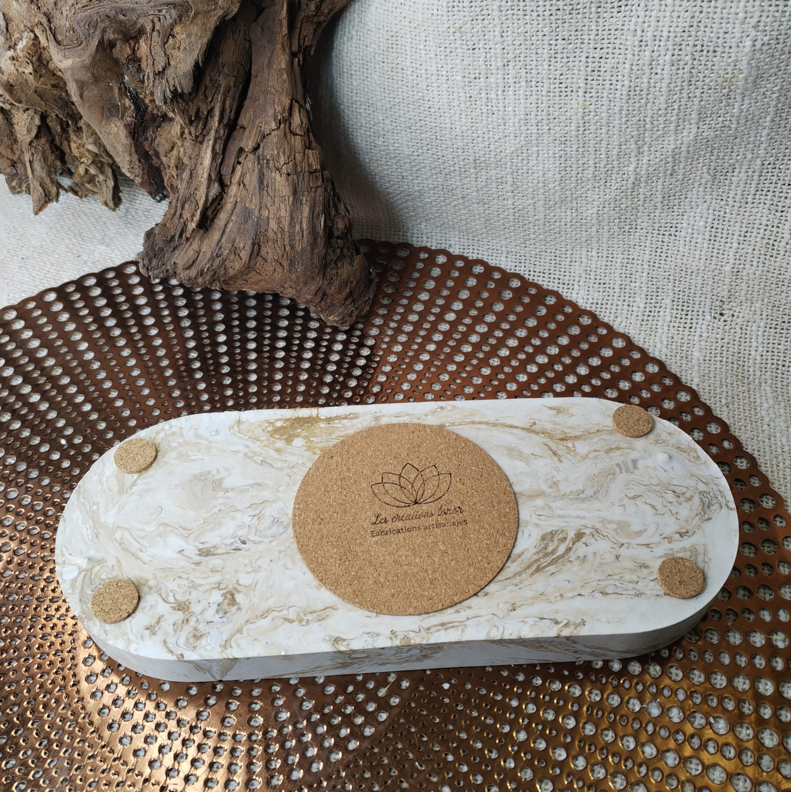 - Matériau : Jesmonite marbré avec des teintes de beige, gris