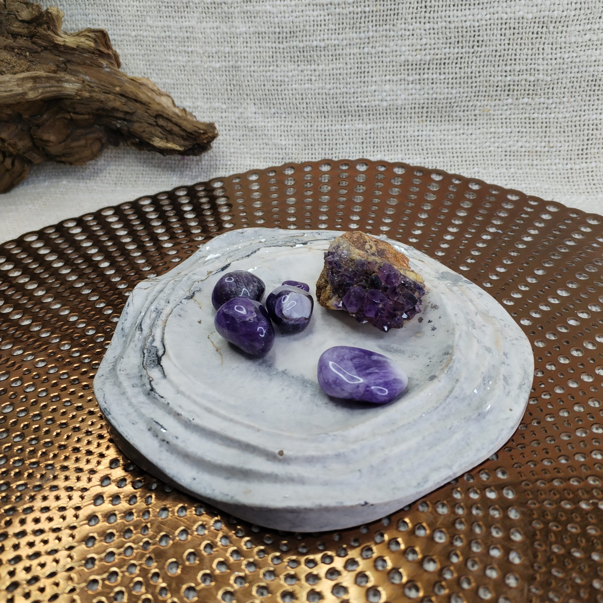 Ce vide-poche est idéal pour organiser vos petits objets tels que bijoux, clés, monnaie, ou même comme support pour vos pierres naturelles et cristaux. Il peut être posé sur une table de chevet, un bureau, une console ou dans une entrée pour une touche de praticité tout en ajoutant une dimension décorative à votre intérieur.
